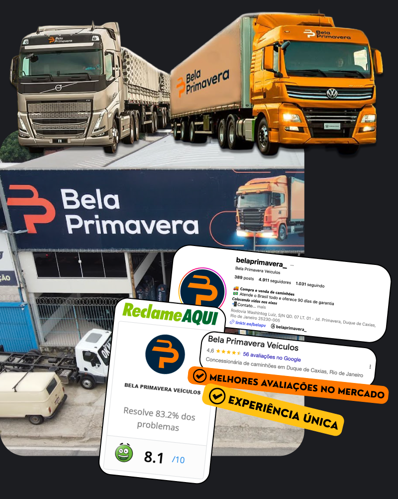 A Bela Primavera Veículos está no mercado há mais de duas décadas no coração de Duque de Caxias (RJ). Somos especialistas em compra e venda de caminhões, com atendimento personalizado, qualidade rigorosa e foco em atender sua operação com seriedade. Atendemos em todo o Brasil, oferecendo além do veículo, 90 dias de garantia, porque acreditamos que você merece tranquilidade ao rodar.